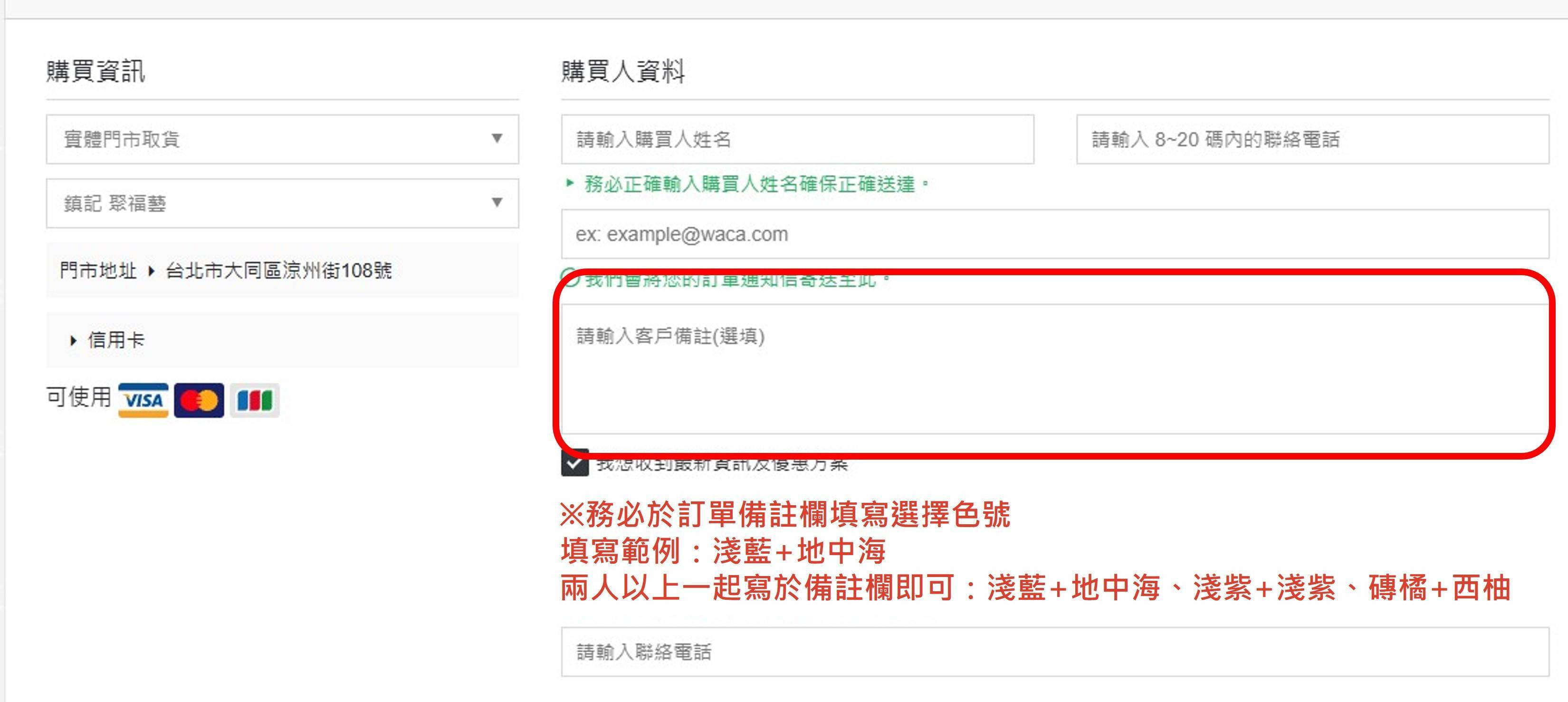 兩人以上一起寫於備註欄即可:淺藍+地中海、淺紫+淺紫、磚橘+西柚