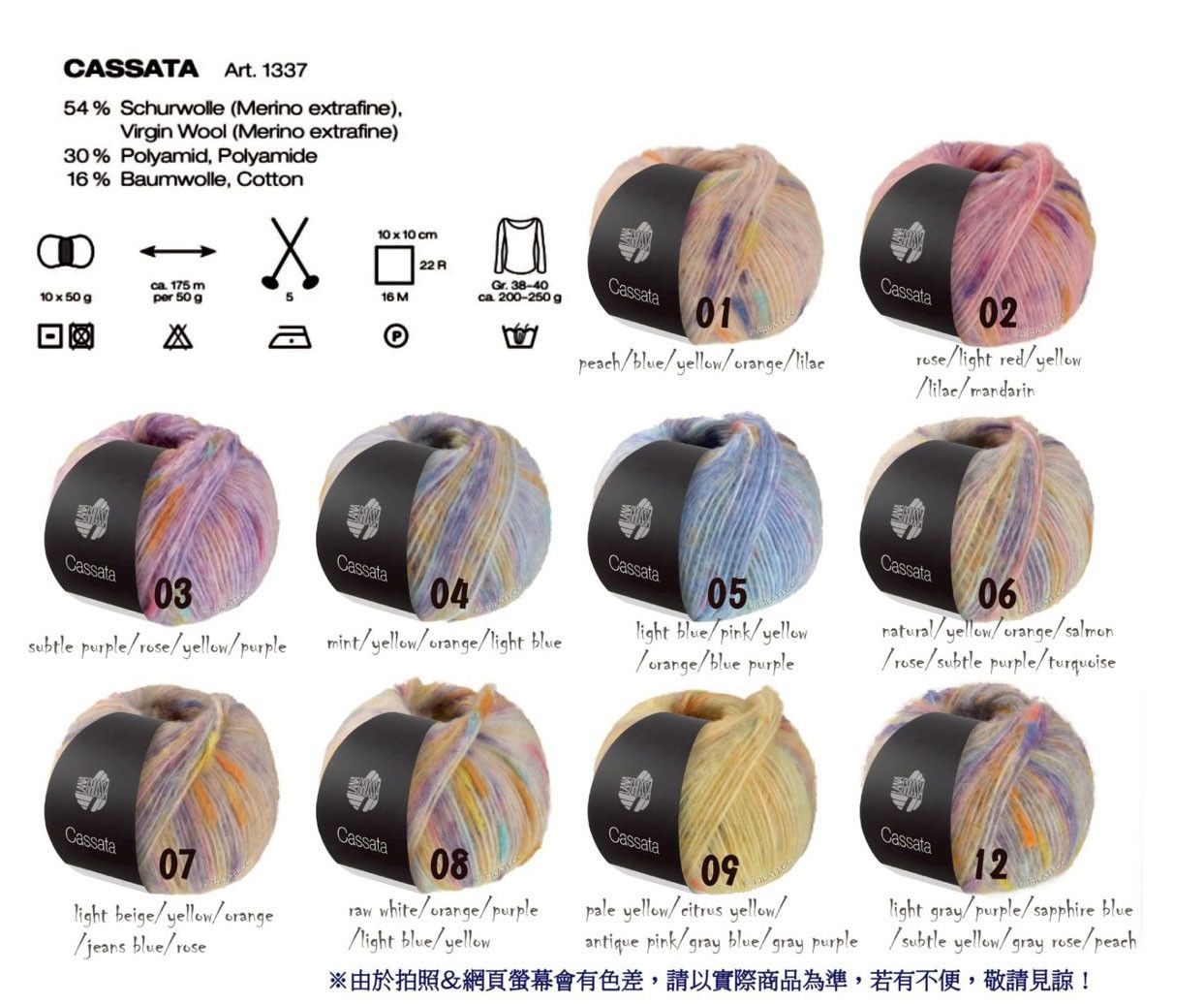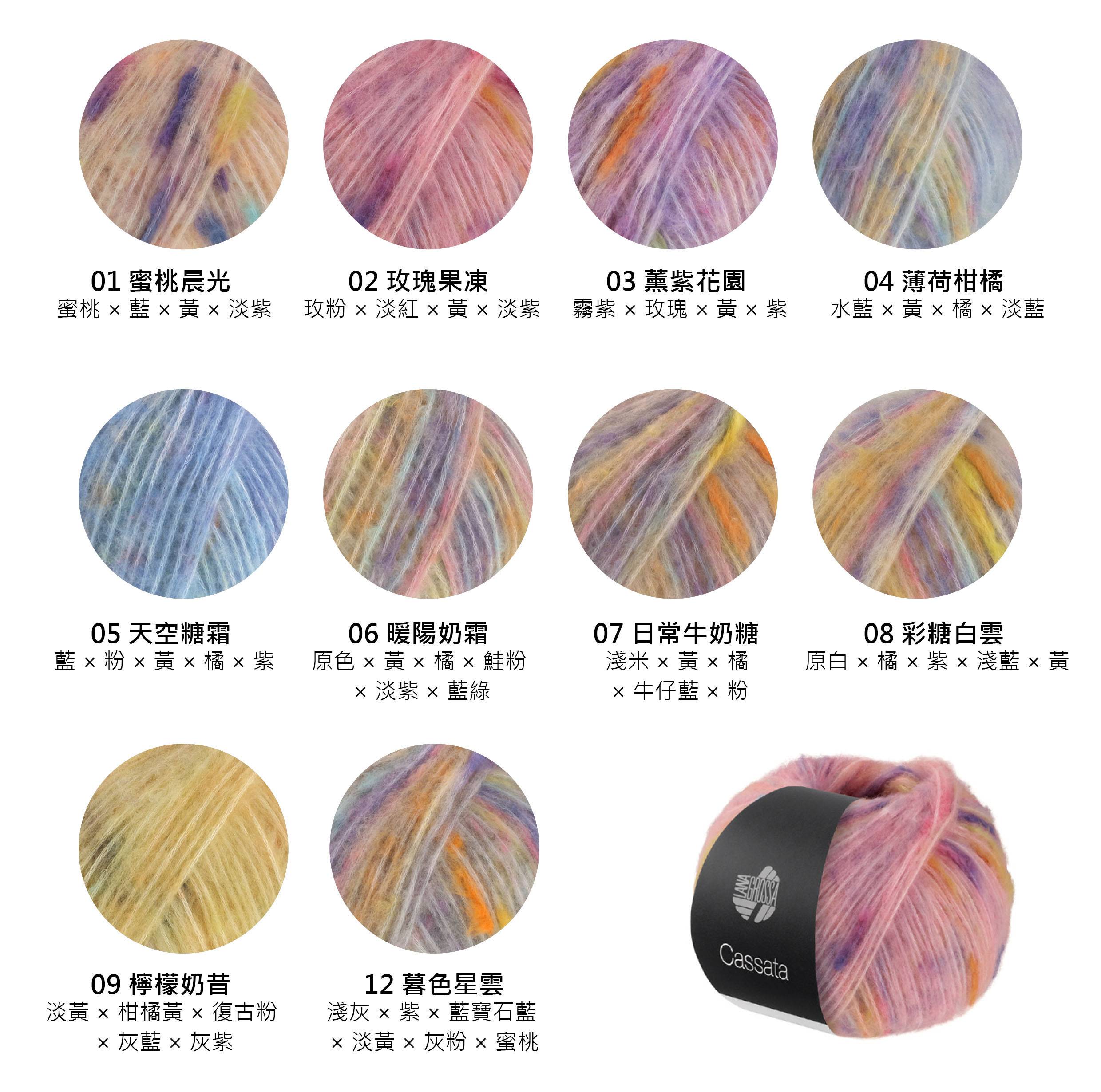棉花糖CASSATA是Lana Grossa旗下的人氣混紡線材之一, 融合美麗諾羊毛的柔軟、棉的親膚、尼龍的穩定度。